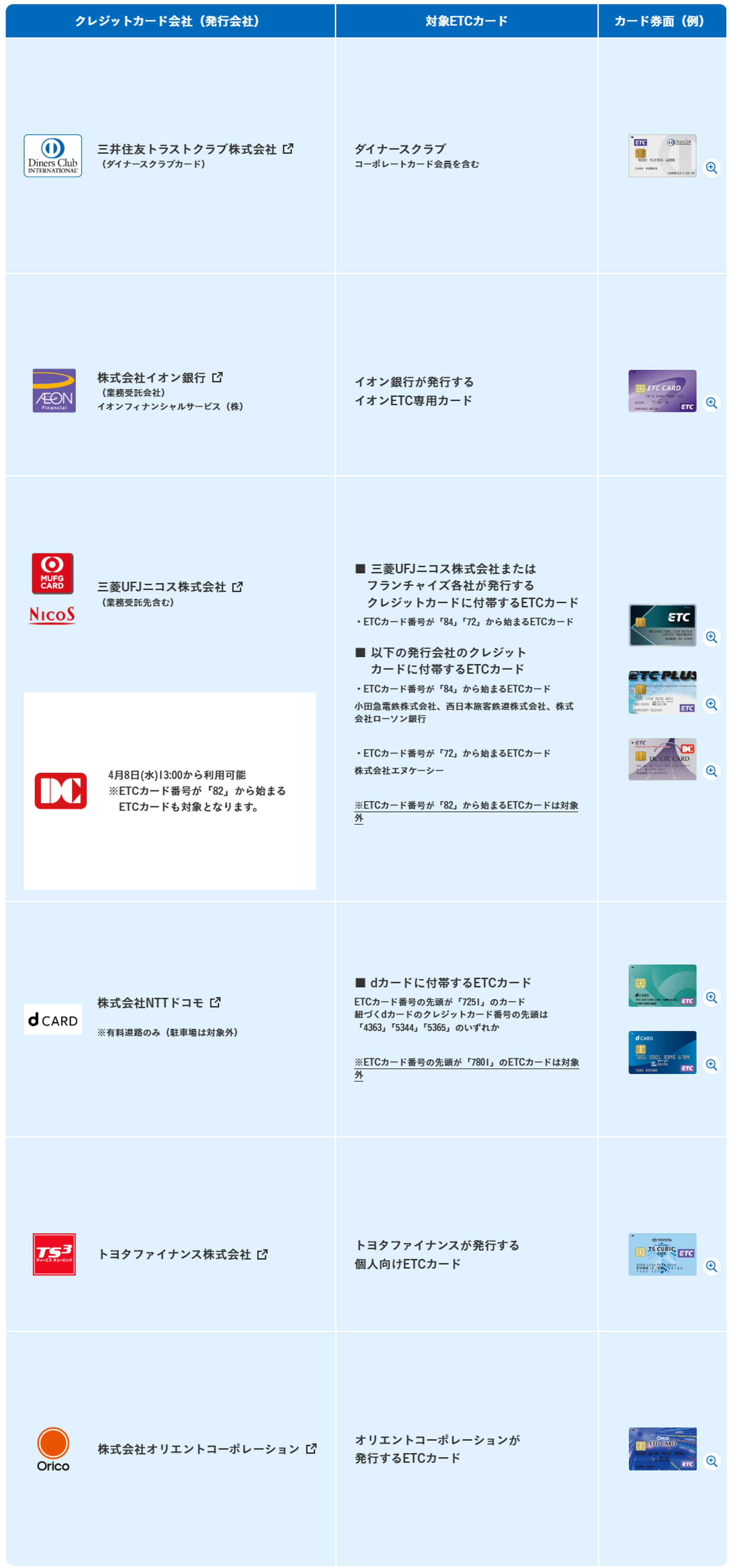 現在利用できるETCカードは運営会社であるアマノ社のホームページでご確認いただけます。
